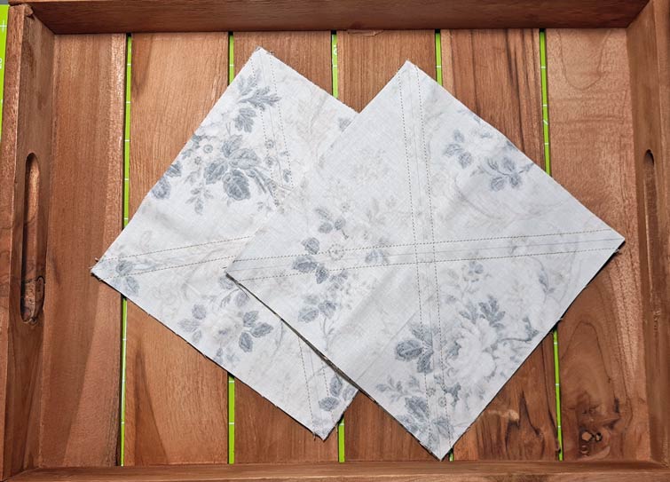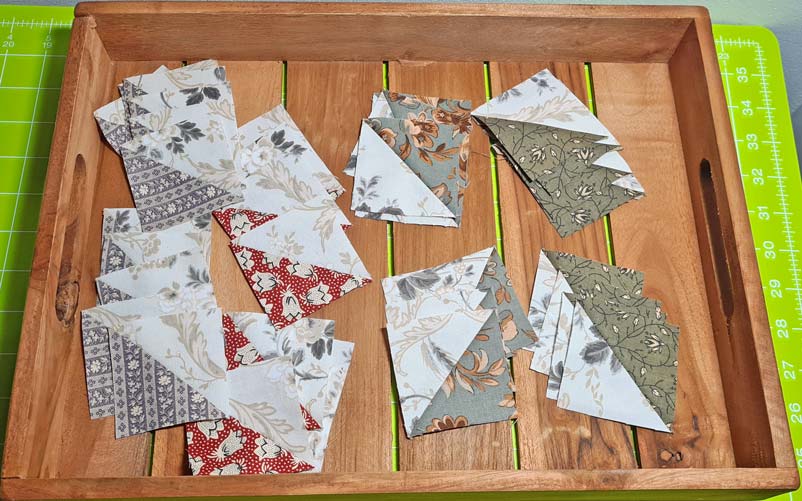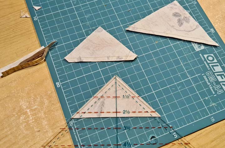 En die half square triangles zitten zo in elkaar wanneer je die methode gebruikt van 1 groter vierkant waar je op de diagonalen lijntjes trekt en daar aan weerszijden stikt. Ik noem ‘m mijn snelle driehoek methode. Die vierkanten kun je in achten snijden en dan heb je zo – poef – 8 blokjes klaar. Ik gebruik een handig precies-voor-dat-doel-geschikt lineaaltje om die blokjes op maat te snijden en zo had ik supersnel mijn 35 blokjes klaar. Ken je de methode nog niet? Dan heb ik hier een link naar een filmpje met wat meer uitleg.