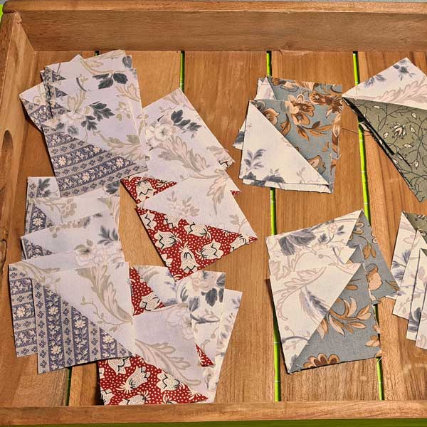 Tja, dat krijg je dan met zo’n deadline voor een blogje voor de deur, zonder dat ik leuke foto’s kan laten zien. Dan komt toch de gedachte op of ik niet iets kleins in elkaar kan draaien. Gewoon even iets tussendoor om lekker gedachteloos bezig te zijn en dat gevoel wat zichtbaar te maken van lekker met die lapjes bezig te zijn. Ik heb zo’n klein dienblaadje liggen waarvoor het wel leuk zou zijn om een klein placematje te maken. Iets simpels, gewoon met een paar driehoek blokjes.