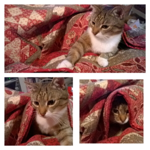 Gelukkig gaat het inmiddels weer beter. Ik heb veel minder last van de symptomen en heb weer de puf om na een dag werken achter een beeldscherm ’s-avonds ook nog lekker aan de slag te gaan. Ik ben klein begonnen om weer op gang te komen en ook om niet gelijk mezelf te ver te duwen. Wat dan weer niet handig voor dit blogje is, is dat ik geen foto’s kan laten zien. De tijd dat ik nog wel kon naaien heb ik besteed aan wat kadootjes. Ze zijn nog niet klaar en dus ook nog niet bij de ontvangers aangekomen. Dat bedoel ik: niet handig! Om van die gedachte even bij te komen plak ik hier gauw even een foto uit de oude doos. Mini-kater Tommy die ‘meehelpt’ om de bies aan te zetten van mijn Day in Giverny.