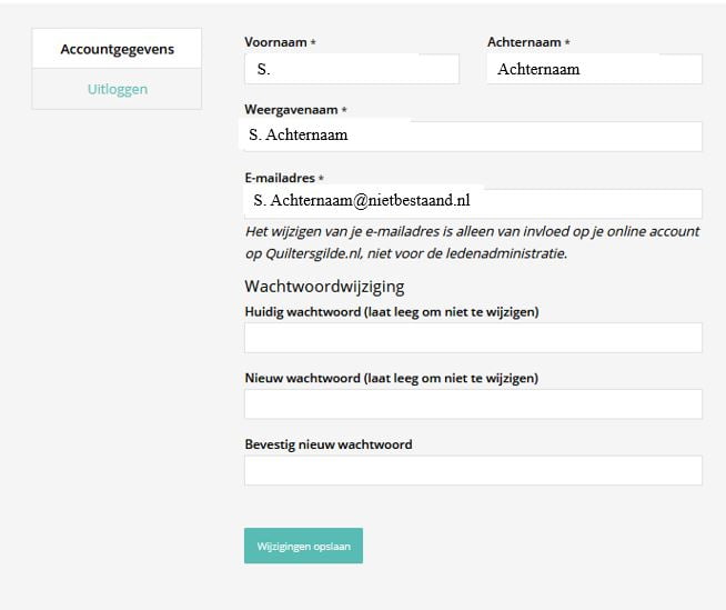 Indien je ingelogd bent, en je klikt op “Mijn account” dan krijg je de informatie te zien die in je account is opgeslagen, namelijk je naam en e-mail adres. Je kunt hier ook je wachtwoord wijzigen, indien je dat zou willen. Ook het e-mail adres kan hier gewijzigd worden. Maar deze wijziging geldt alleen voor het Quiltersgilde account en niet voor de ledenadministratie of de Nieuwsbrief. Tot slot kun je hier ook uitloggen door op “Uitloggen” te klikken.