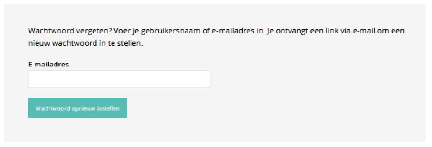Mocht je je wachtwoord vergeten zijn, dan kun je klikken op “Wachtwoord vergeten?” (in het blauw op de foto hierboven). Je komt dan op een pagina waar je je e-mailadres kunt opgeven. Gebruik dan natuurlijk wel het e-mail adres waarmee je je account hebt aangemaakt, want anders wordt je e-mail adres niet herkend.