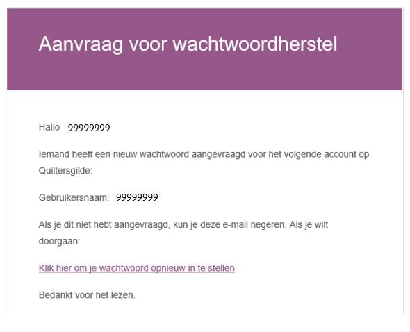 Kijk nu in je mailbox voor een e-mailbericht van het Quiltersgilde. Mocht je het bericht niet in je mailbox vinden, kijk dan even in je spambox. Bedenk dat het soms wel even kan duren voordat het bericht in je mailbox terecht gekomen is. Klik op de blauwgekleurde link in het bericht. Je komt nu op de website terecht waar je een wachtwoord kunt opgeven.