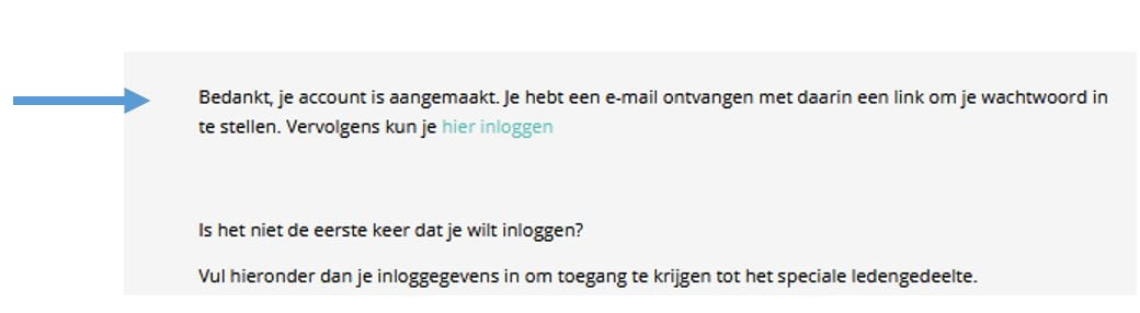 Ook nu kom je weer op deze pagina terug. Maar nu zie je het bericht dat het account is aangemaakt (bij de blauwe pijl op de rechter foto hieronder).