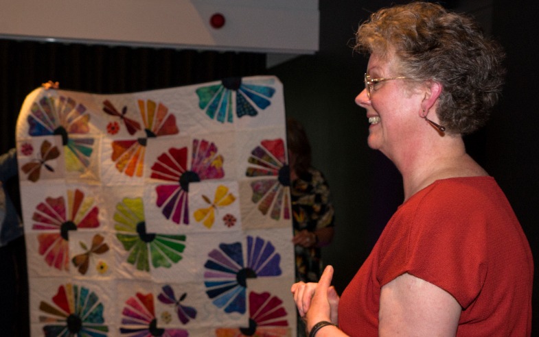 Vanuit de Regiovertegenwoordigers en het bestuur kreeg Gerda een fleurige quilt aangeboden, met bloemen en vlinders. Knap in elkaar gezet door Greetje Hein en Marijke Nieuwenhuijsen.