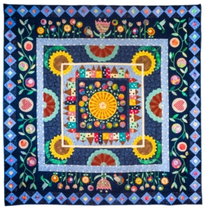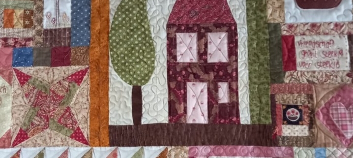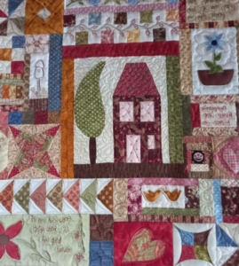 waar mijn gasten zich geborgen en veilig voelen. Dat wil ik als middelpunt in de quilt en ik ontdek dat dit op verschillende manieren kan. In een medaillonquilt omring je een middenmotief met meerdere randen, guirlandes of appliqueerwerk. Op dit middenstuk plaats je je huis. Dat kan als applicatie, in paperpiecing of als borduurwerk. De quilt ´36 Albrook Hill` van Margareth Muw( Bron: Quilts from La Gare and other Mewsings. Margareth Mew, 2021 Quiltmania) laat dit heel kleurrijk zien.
