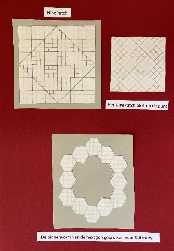 De NinePatch is een heel algemeen bekend ´eenvoudig´ patroon. Echter door te spelen met de kleuren van de vierkantjes in verschillende banen licht-donker, door het gebruik van persoonlijke kleuren en stoffen, wordt de NinePatch een uitdaging. Zet het blok eens op zijn punt. Of probeer iets uit met verschillende kleuropbouw binnen een NinePatch blok. Ik teken alle mogelijkheden eerst uit op ruitjespapier. Door gekleurde blokken af te wisselen met effen blokken ontstaat er ruimte voor borduur- of applicatiewerk. Die effen blokken wil ik benutten voor afbeeldingen rondom gastvrijheid. Dit kan ook bij de hexagon. Deze vorm leent zich ook om de binnenruimte te gebruiken voor afbeeldingen in borduur- of applicatiewerk.