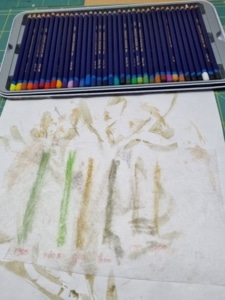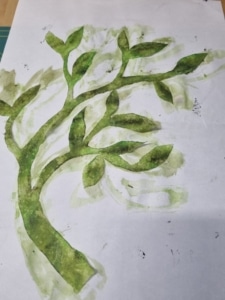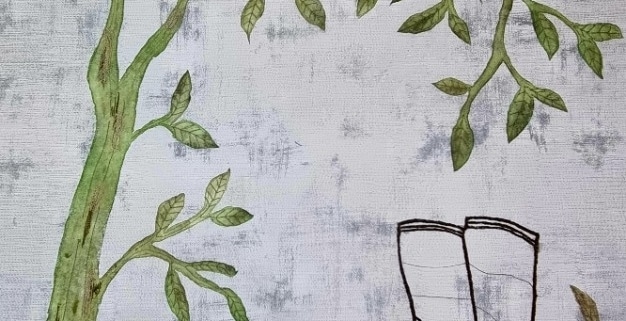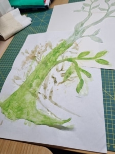 Op een grunge stof als achtergrond, die helemaal is doorgestikt, heb ik een afgebroken tak/twijg gemaakt. Hiervoor heb ik lutrador gebruikt, het voorbeeld uitgebrand en gekleurd met inktense potloden. Op de tak wat verpakkingsmateriaal dat op een cadeautje zat en wat ik bewaard had.