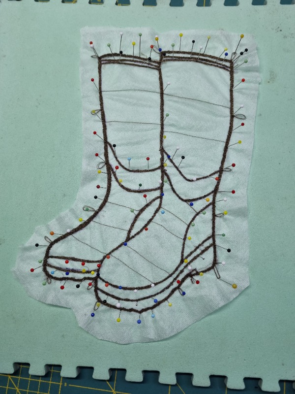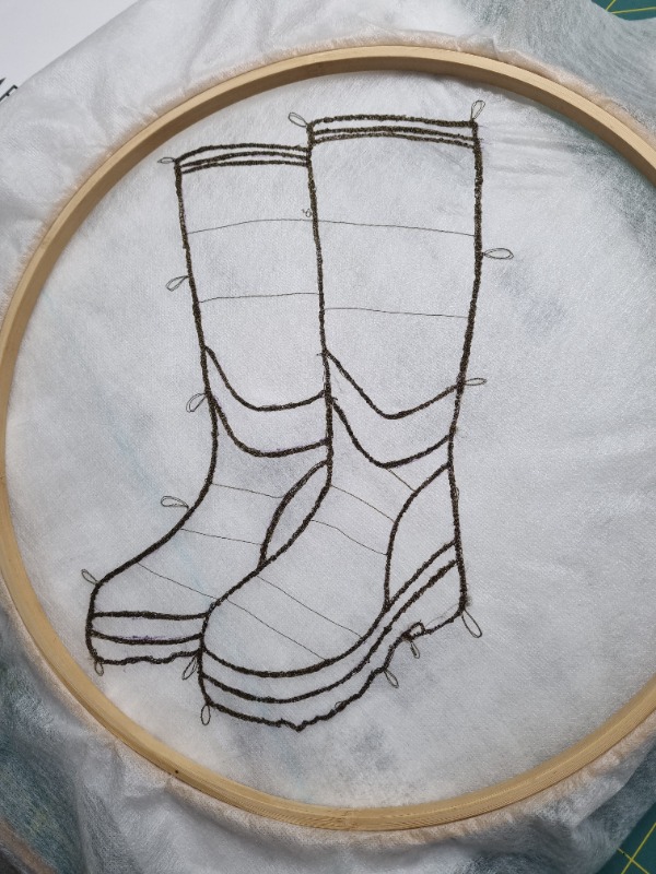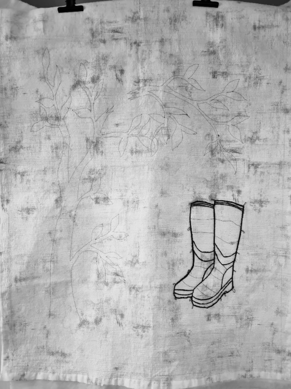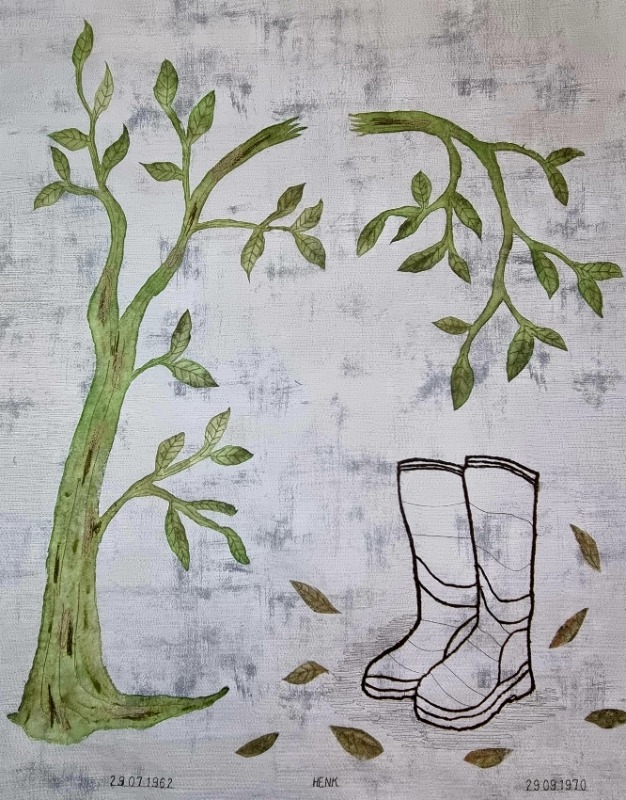 De laarsjes die hij droeg staan op mijn netvlies. Dit is het laatste wat ik gezien heb van hem. De ochtend na het ongeluk werden ze thuisgebracht samen met zijn kleding. Mijn moeder zette de laarsjes in de bijkeuken. Daarom moesten die laarsjes op de quilt. Ik heb ze gestikt op in water oplosbaar vlies met een donkergroen garen. Door kleine rondjes te draaien kreeg ik een dikkere lijn. Voor het uitspoelen heb ik het op een ondergrond gespeld zodat het in zijn vorm bleef. Na het opdrogen kon ik het op de stof stikken.