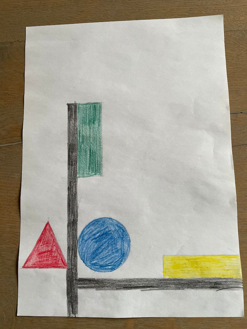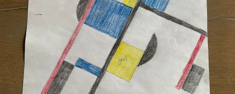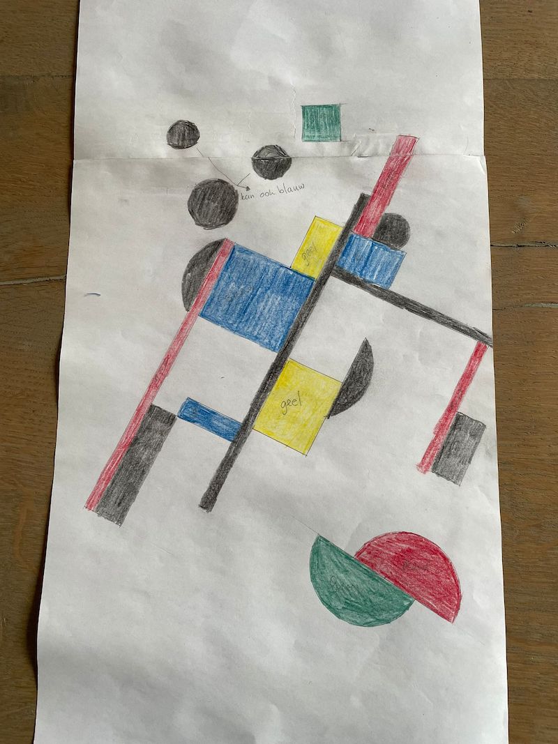 En dan gaan de ‘grijze’ cellen aan het werk, iets tekenen en inkleuren, wikken en wegen, wat ga ik doen. Wat wordt mijn interpretatie van het Rietveld/Schröderhuis, een plattegrond of een zij aanzicht?