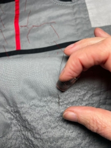 Ik doe alles met de hand, dat betekent op tijd beginnen😊 zodat de quilt inderdaad eind januari 2023 af is. Een stukje quiltwerk zie je hieronder.
