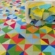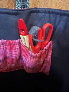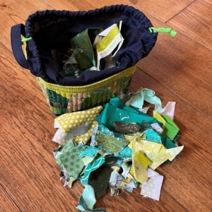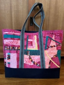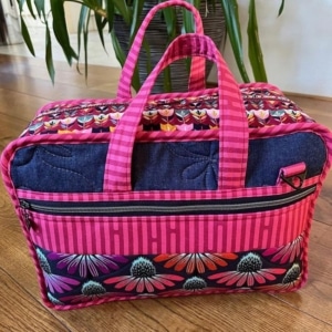 Een tas naar eigen idee van improv blokken van een uitdaging en een oude spijkerbroek voor de onderzijde. Met een binnenvoering en verschillende handige vakken en formaat zodat een snijmat, lange liniaal en strijkmat erin passen om quiltspullen mee te kunnen nemen.