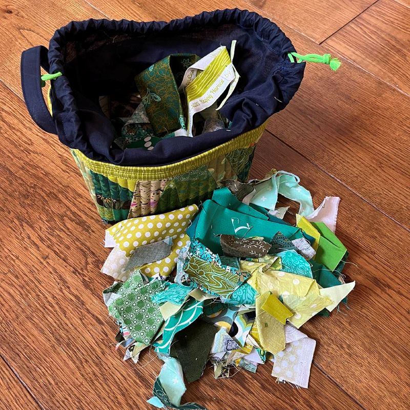 Mandjes gemaakt met stukjes reststof voor het bewaren van stukjes reststof naar patroon ‘Juniper Basket’ van Sotak Handmade – ik heb een hele regenboog gemaakt.