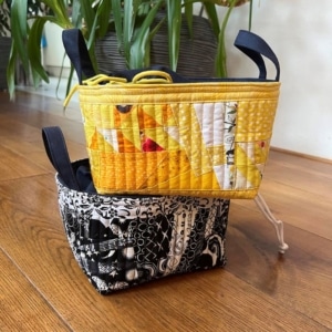 Ik begon met etuis en mandjes te maken van Sotak Handmade – een in Nederland wonende ontwerpster, dus altijd leuk om die te steunen. Haar voorbeelden zijn ook wel van gequilte delen, maar in de meeste patronen die ik heb gezien gaat het om stof met een tussenvulling (eventueel geplakt) maar in basis niet doorgequilt. Dat kun je natuurlijk zelf heel gemakkelijk wel doen (en dat doe ik dan ook in de meeste gevallen). Let daarbij op dat je een sandwich van iets groter dan de opgegeven maten neemt, omdat de sandwich met quilten natuurlijk wat krimpt. Ik neem voor de meeste delen 0,5 inch extra rondom (echt grote stukken 0,75 inch). Dit is deels voor het krimpen en deels omdat het niet altijd lukt om de randen netjes te quilten: je hebt toch iets nodig om het vast te houden.