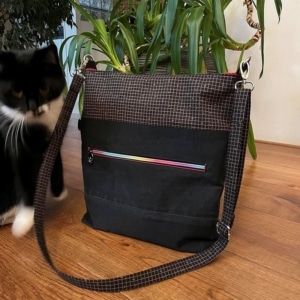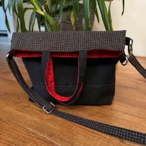 Deze handtas is gemaakt met een oude zwarte spijkerbroek als basisstof naar patroon ‘Megan Foldover Tote’ van Sotak Handmade (niet doorgequilt).