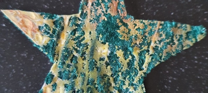 Mooie effecten zijn te bereiken door tyvek samen met peau de pêche te bewerken.(synthetische fluweel) Beide synthetische stoffen reageren anders bij het verhitten en versmelten met elkaar. De sterren in de kerstkaart zijn ook zo ontstaan, de tyvek en de peau de pêche smelten samen.
