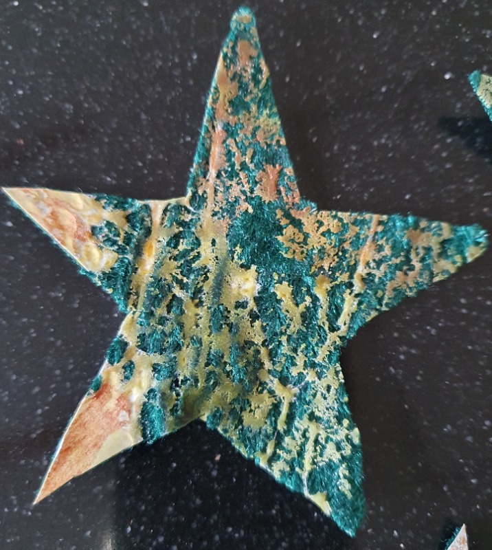 Mooie effecten zijn te bereiken door tyvek samen met peau de pêche te bewerken.(synthetische fluweel) Beide synthetische stoffen reageren anders bij het verhitten en versmelten met elkaar. De sterren in de kerstkaart zijn ook zo ontstaan, de tyvek en de peau de pêche smelten samen.