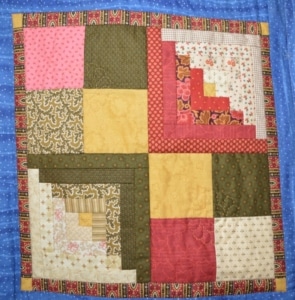 Ook een log cabin blok met gebruikte quilt stofjes moest erin; Marry heeft voor de kleinkinderen veel quilts met log cabin gemaakt.