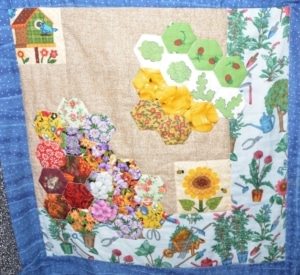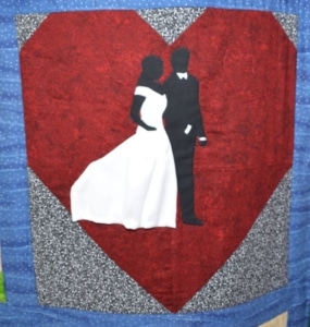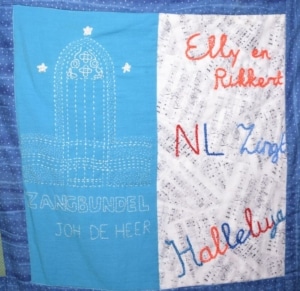 Het eerste blok was de trouw tekst op hun huwelijk; de rode hartjes zijn van de stof van een trouwjurk die ze samen met een dochter gemaakt heeft.