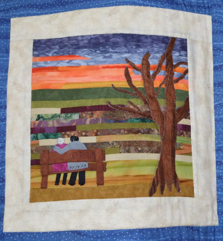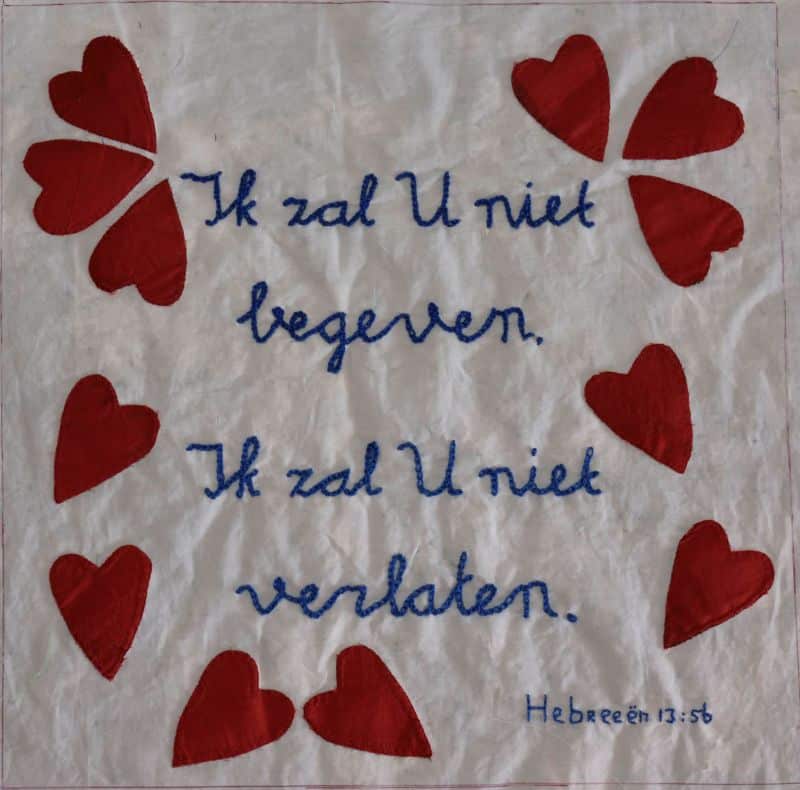 Het eerste blok was de trouw tekst op hun huwelijk; de rode hartjes zijn van de stof van een trouwjurk die ze samen met een dochter gemaakt heeft.