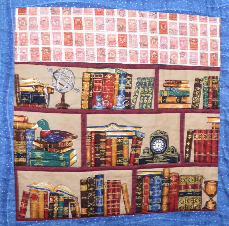 We hebben ervan genoten om deze quilt te maken. Zo leuk om allemaal herinneringen op te halen en te verwerken. We hebben veel voorraadstofjes gebruikt, maar ook heel gericht een paar aankopen gedaan (bijvoorbeeld de postzegelstof en boekenplankenstof).