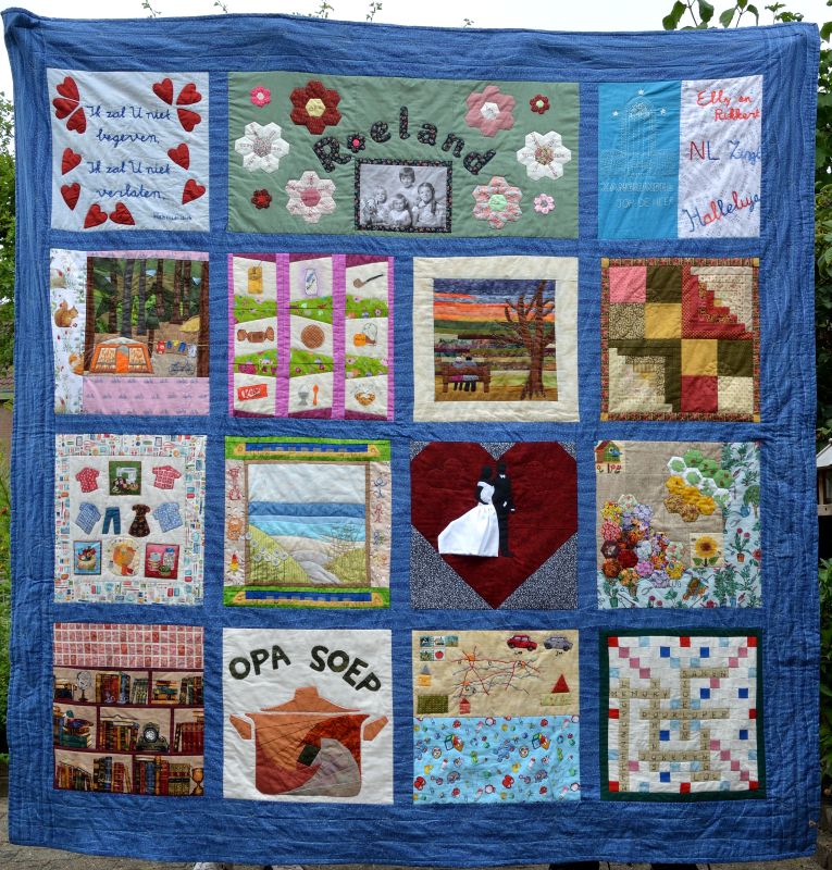 Marry Roeland quilt al jaren. Ze maakte voor de kleinkinderen quilts voor op bed. Op het bed van (o)pa en (o)ma lag echter geen quilt. Dus in het jaar dat ze 60 jaar getrouwd zouden zijn, zijn we als familie aan de slag gegaan met een herinneringsquilt.
