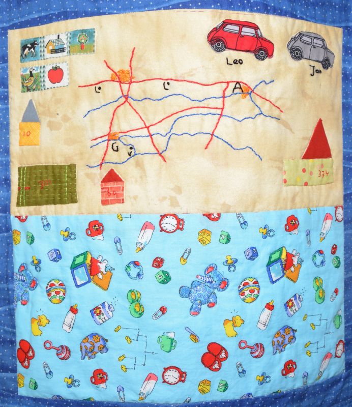 Het volgende blok was deels een geborduurde landkaart met woonplaatsen en alle huizen waar Dick en Marry samen gewoond hebben. De andere helft was een babystofje, omdat oma veel opgepast heeft.
