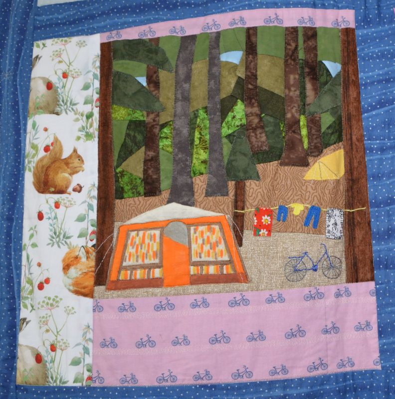 Vroeger gingen we als gezin vaak kamperen; op de fiets naar de camping. Het natekenen van de tent die we hadden was nog een hele uitdaging. Voor de kleurtjes hebben we Inktense blocks gebruikt.
