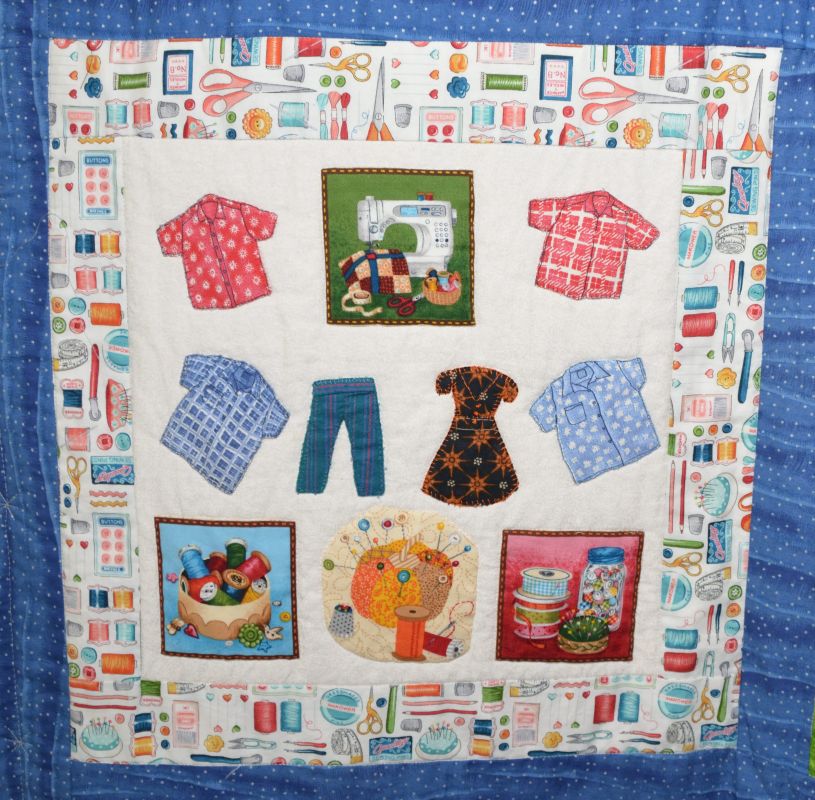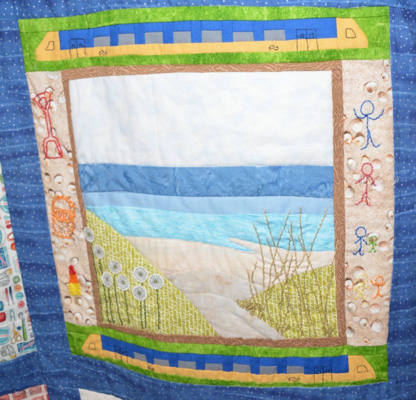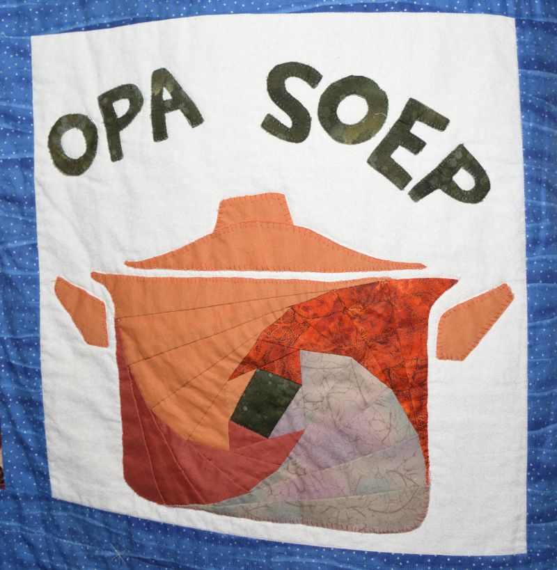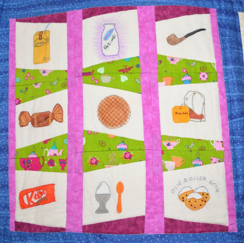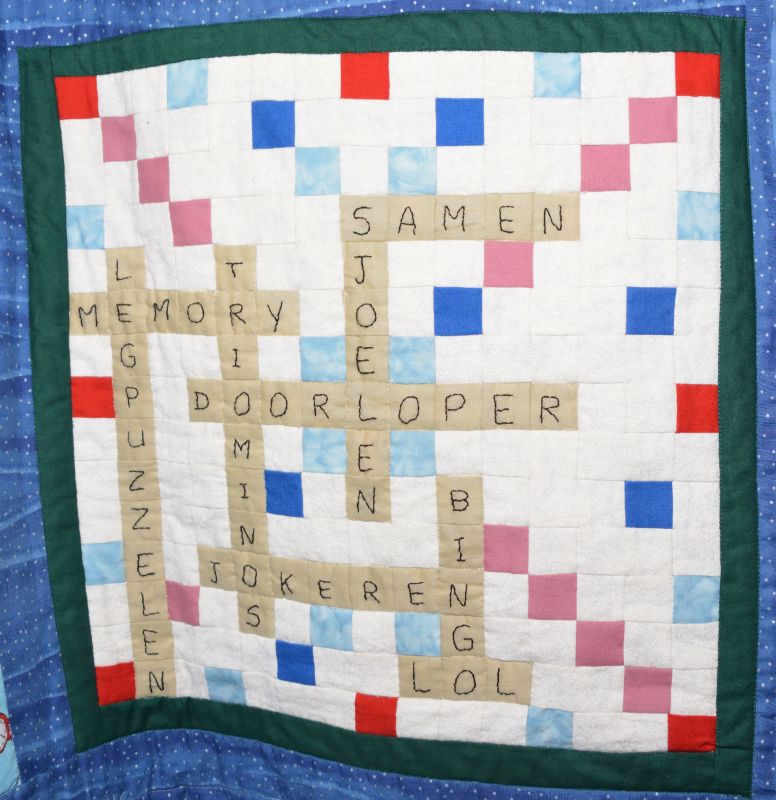 Haar enthousiasme over het quilten heeft ze overgebracht op twee dochters, een kleindochter en een schoonzoon. Dus die gingen aan de slag. Alle (klein)kinderen hebben meegedacht over wat er dan op de quilt moest komen. Ideeën genoeg.