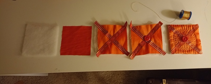 En dus de oranje stof in lapjes van 10×10 cm gesneden. Resten fiberfill versneden in stukken van 10×10 cm. De kisten met knopen-op-kleur een voor een omgekieperd en knopen gezocht. Bijpassend garen uit de garenlade (en zelfs in de kringloop) gezocht en gevonden. Het feest kon beginnen!