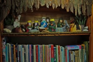 Thea’s echtgenoot heeft een stalletje met kribbe gemaakt voor midden in de boekenkast… Kerstmis voorbij dan de boeken er weer in. Misschien inspiratie door de boekenplank onder de stal…
