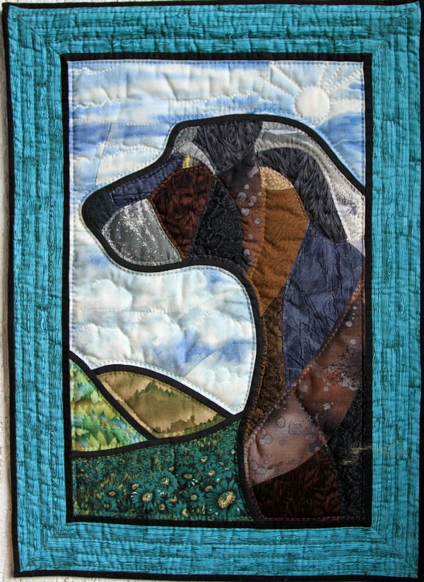 De grote hond van Thea is een Ierse Wolfshond, het grootste hondenras dat ik ken. Zelf schrijft ze voor het tijdschrift ‘Shamrock’, gericht op de bezitters van Ierse Wolfshonden. Ierland heeft een speciaal plaatsje in haar hart. Op de foto Thea’s echtgenoot met de hond en een quiltje waarin ze heeft geprobeerd iets van de Ierlandsfeer weer te geven. (klik op onderstaande foto’s om ze groter in beeld te krijgen)