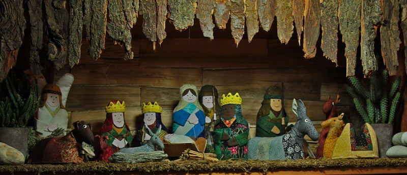 “Vijf jaar geleden (naar ik denk) heb ik met ongelofelijk veel plezier de figuurtjes van de Kerststal uit Quiltnieuws gemaakt. Allemaal restjes en van ieder dier een groot en een klein figuurtje gemaakt… (Maria een baby dan zij ook…) Waxinelichtjes als kampvuur. Mogelijk vindt u het leuk om eens te laten zien hoe het de familie in de stal gaat”.