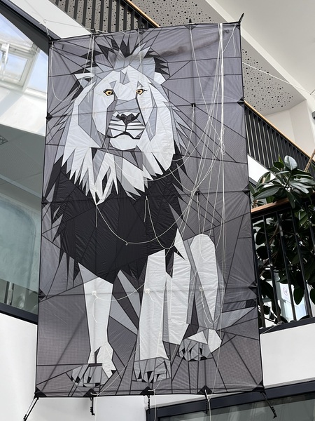 Heel jammer voor de organisatie want er was veel te zien op de verschillende locaties. Zelf hebben we niet veel locaties kunnen bezoken, behalve die naast ons, in de hal van een andere school. Hier zagen we quilts van Claudia Scheja en één van de vele mooie vliegers die heel hoog hingen.