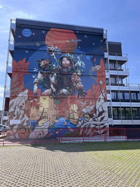 De gastvrijheid van het Duitse Patchworkgilde was hartverwarmend. Steeds kwam er iemand van het bestuur langs om te vragen of alles nog goed ging en op zondag werden we zelfs uitgenodigd voor de lunch, samen met één andere gast. Omdat er dan niemand in de stand zou zijn was er een Quilt ‘angel’ geregeld die de honneurs een uurtje voor ons waarnam. Onderweg lopend naar onze lunch, zagen we nog een prachtig bespoten/beschilderde muur.