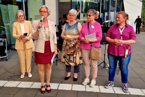 Na de opbouw waren we donderdagavond uitgenodigd voor de officiële opening van de Duitse ‘Patchworktage’. Op het plein van de Volks Hoch Schule werden we verwelkomd met muziek en een drankje. De loco burgemeester opende formeel het evenement en er werden door het Duitse gildecertificaten uitgereikt aan deelnemers. Tot onze verrassing kregen wij als Nederlands Quiltersgilde als eerste het certificaat uitgereikt.