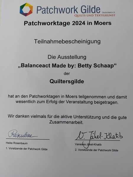 Na de opbouw waren we donderdagavond uitgenodigd voor de officiële opening van de Duitse ‘Patchworktage’. Op het plein van de Volks Hoch Schule werden we verwelkomd met muziek en een drankje. De loco burgemeester opende formeel het evenement en er werden door het Duitse gildecertificaten uitgereikt aan deelnemers. Tot onze verrassing kregen wij als Nederlands Quiltersgilde als eerste het certificaat uitgereikt.