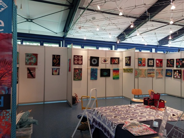 We hadden de 88 miniatuurquilts meegenomen, die ook in Rijswijk op de tentoonstelling in de Broodfabriek hadden gehangen. Helaas was er niet genoeg ruimte om alle quilts op te kunnen hangen. We hebben ons best gedaan om er een aantrekkelijke en vrolijk gekleurde tentoonstelling van te maken.