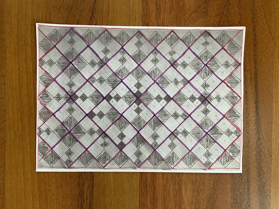 Het was al snel duidelijk dat ik voor het Juweeltje zou gaan want ik werk liever met vierkantjes dan met driehoeken. Ik ben gestart met tekenen op ruitjespapier en mijn keuze kwam uit op blokjes van 8 x 8. Daar ben ik lang mee bezig geweest en na veel gepuzzel had ik een resultaat waar ik redelijk tevreden mee was.