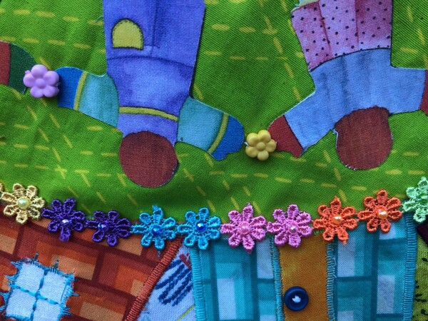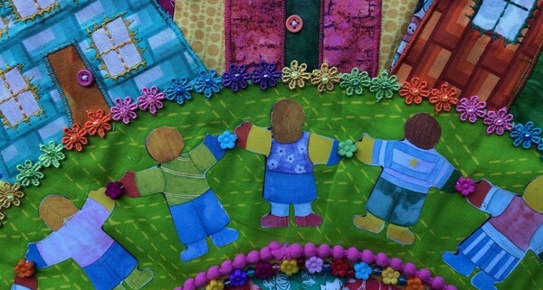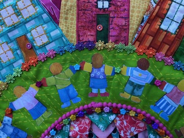 Diana vond haar tekst, een gedicht, op een gevel ergens in de wijk. Ze liep er vaak langs en vroeg toestemming van de dichteres om een deel van het gedicht te gebruiken in haar quilt. Bovendien gebruikte zij de afbeelding van een spel om de tekst te vertalen naar een beeld. Daarvoor is ook toestemming gevraagd van de spelletjesmaker Ravensburger. Dat spel is ook de naam van haar bedrijf. Dat alles was reden voor haar om heel figuratief te werken zodat de quilt voor iedereen leesbaar is.