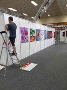 De volgende dag gingen we langs een iets langere weg maar met veel minder bochten op weg naar Sainte-Croix-aux Mines, want daar was onze expositie. Nadat we alles hadden uitgeladen en op de plek gelegd kwamen er, oh wonder, twee mannen met ladders die voor ons alles op de goede hoogte gingen ophangen.