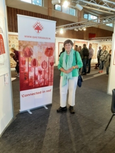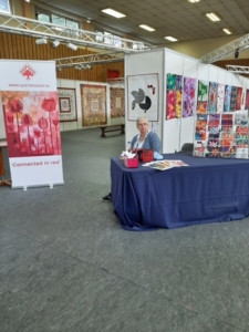 De tentoonstelling was van donderdag tot en met zondag, vier hele dagen. Het was gezellig druk op donderdag, vrijdag en zaterdag was het erg druk en zondag was het heel rustig. De bus uit Nederland was donderdagavond gearriveerd. Naast de mensen uit de bus was er ook veel aanloop van andere leden die op eigen gelegenheid waren gekomen. We hebben ook nog vijf nieuwe leden in kunnen schrijven en heel veel kaarten verkocht. Er is van de ingezonden quilts een nieuwe collectie kaarten gemaakt die in november ook in Groningen te koop zijn. Ook is er een banner gemaakt van de beeldmerkquilt, hier een foto met de maker van deze quilt Femke Kunnen-Jacobs.