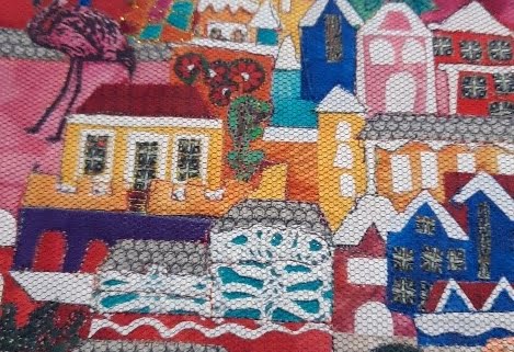Kleurige lapjes zijn mijn ‘roots’. Ik kies altijd felle kleuren. Al gauw bedacht ik om de Annabaai in Willemstad te maken. Dus wilde ik sommige gebouwen ‘echt’ laten lijken en ging ik anders te werk. Hotel Otrobanda werd zo nauwkeurig mogelijk nagemaakt. Alle afbeeldingen werden nagemaakt aan de hand van foto’s van de huizen, brug, markt, pontjesbrug en andere objecten. Tijdens het maken verheugde ik mij op mijn reis naar Curacao, waar ik het nieuwe huisje van mijn broer Lex en zijn vrouw Sylvia kon bewonderen en de vertrouwde plekjes kon bezoeken.