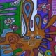 Dus, Hilda aan het werk. Latex, kleurpigmenten in de favoriete kleurtjes van de kinderen, rollers, kwasten, en alle resten acrylverf bij elkaar.