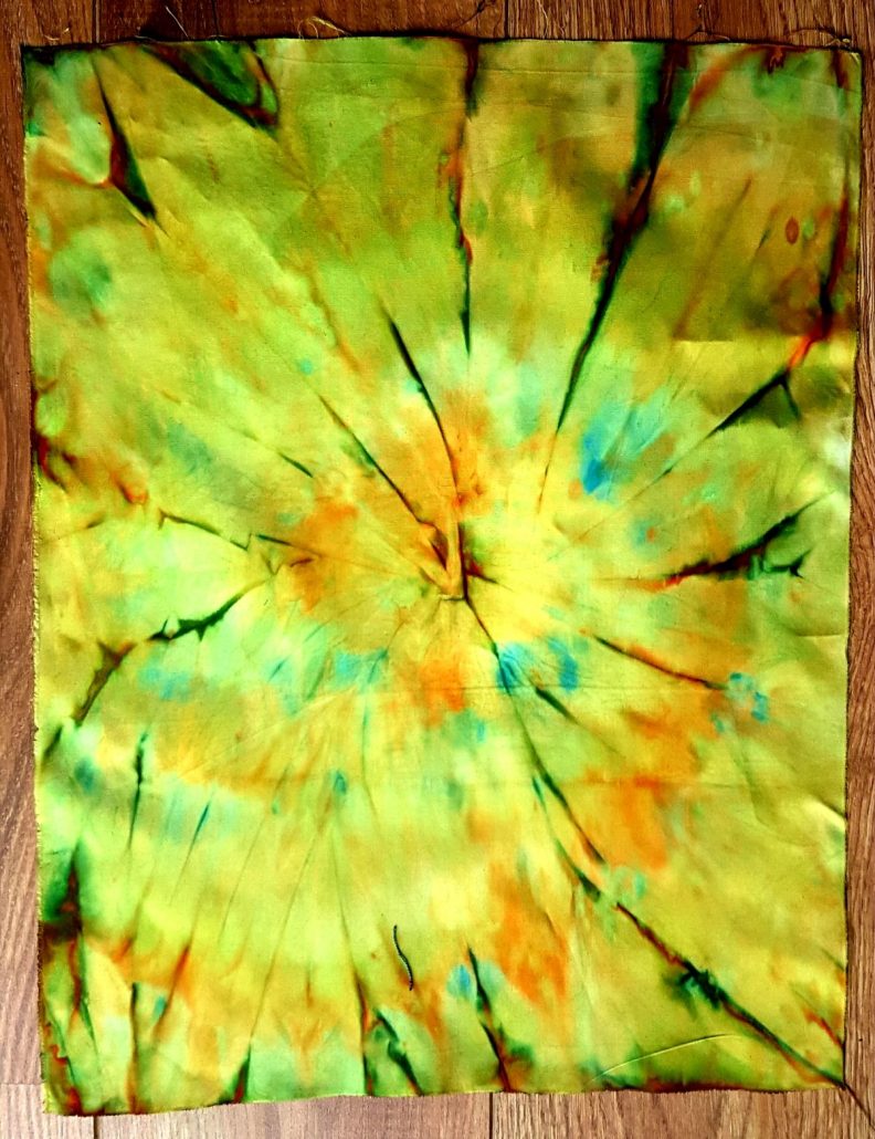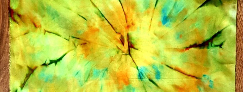 stof natmaken, verf erop, opvouwen of vanuit het midden optillen en draaien. De zon maakt het af, als het droog is strijken