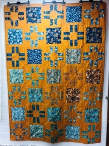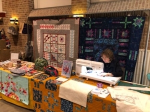Nou ben ik een van de vrijwilligers bij The Quilt Cottage in Winterswijk en was ik al een paar keer mee geweest naar regiodagen van de Quiltersgilde. Met die ervaring zei ik enthousiast “ja, leuk”. Het was de eerste keer dat ik zelf een tafel had op een beurs. De beurs vond ook nog eens plaats in het geboortedorp van mijn man, dus het was dichtbij en bekend.