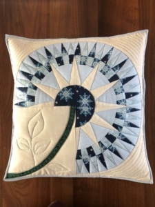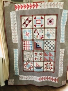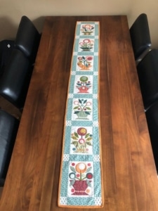 Hoe ik deze had gemaakt? Een paar met hand; mijn eerste samplerquilt en een tafelloper met applicaties van Ellen Remijnse. Sommigen waren verrast door het kleurgebruik van een quilt, namelijk donkerblauw met paars en groen. Zo kwamen fijne gesprekjes tot stand.