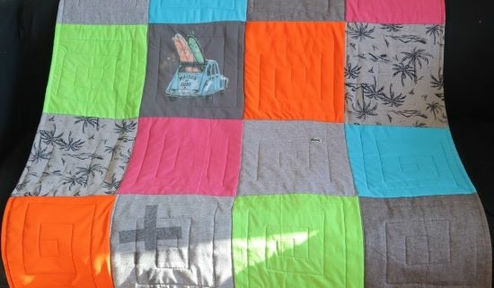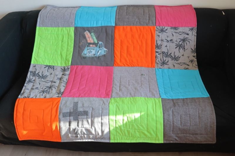 Kleurrijk was de wens en het liefst een Boho patroon met neon, groen, oranje, roze of een andere felle kleur. Geen probleem! Dacht ik … Echter, alle kleding die ik kreeg was donker van kleur. Om toch een zomerse vibe te creëren heb ik grote blokken effen stof toegevoegd. Dit in de kleuren van de vakantieauto van een van de prints. Op deze manier past de quilt beter bij de wensen van de ontvanger, en op deze manier komen de belangrijke kledingstukken meer tot hun recht.