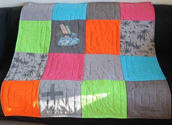 Mijn oudste zoon heeft 20 jaar zijn tshirts gedragen en bewaard die voor hem belangrijk waren. Op een dag vraagt hij mam kun jij mij daar een quilt van maken. Natuurlijk kan ik dat (slik, t shirts met gaatjes en verrassen hoe ga ik dat aanpakken). Na veel denkwerk en overleg met mijn quilt is het een prachtige quilt geworden. Hij is er zooo blij mee.