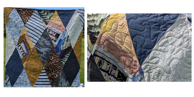 Ze wilden een hippiequilt die wel rustig was. Dit was nog best een uitdaging omdat het kleding was met hele drukke diverse prints. Door grote blokken te pakken en door het ruitpatroon kwam er toch rust in de quilt. Ook heb ik voor een speelse balans tussen de kleuren gezorgd. Ik heb tenslotte uit de losse pols gequilt met een lijnenspel wat de hele quilt samenbracht. Het quiltwerk is vaak wat het uiteindelijke werk leven geeft.