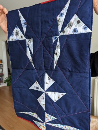 Op de foto zie je een voorbeeld van een quilt die gemaakt is voor een algemene tentoonstelling van het Quiltersgilde. Met alle Moqingbirds van de moderne bee bij elkaar hebben we allemaal een blok vervormd. Die hebben we uitgewerkt met donkerblauwe stof en een randje robijn. De witte stoffen zijn deels overhemden van mijn opa. Ik wilde namelijk graag iets met hergebruik doen, omdat ik in principe altijd met gered textiel werk. Ook pasten de witte overhemden mooi in het ontwerp. En zo werd het naast een moderne quilt voor de tentoonstelling ook een herinneringsquilt!